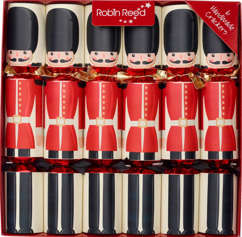 These striking red and black Christmas crackers feature smart London guards on a white background. Finished with stylish gold and black ribbons. Each Christmas cracker contains a snap, a Piccadilly gift, a deluxe party hat and an amusing joke. Six in a box.